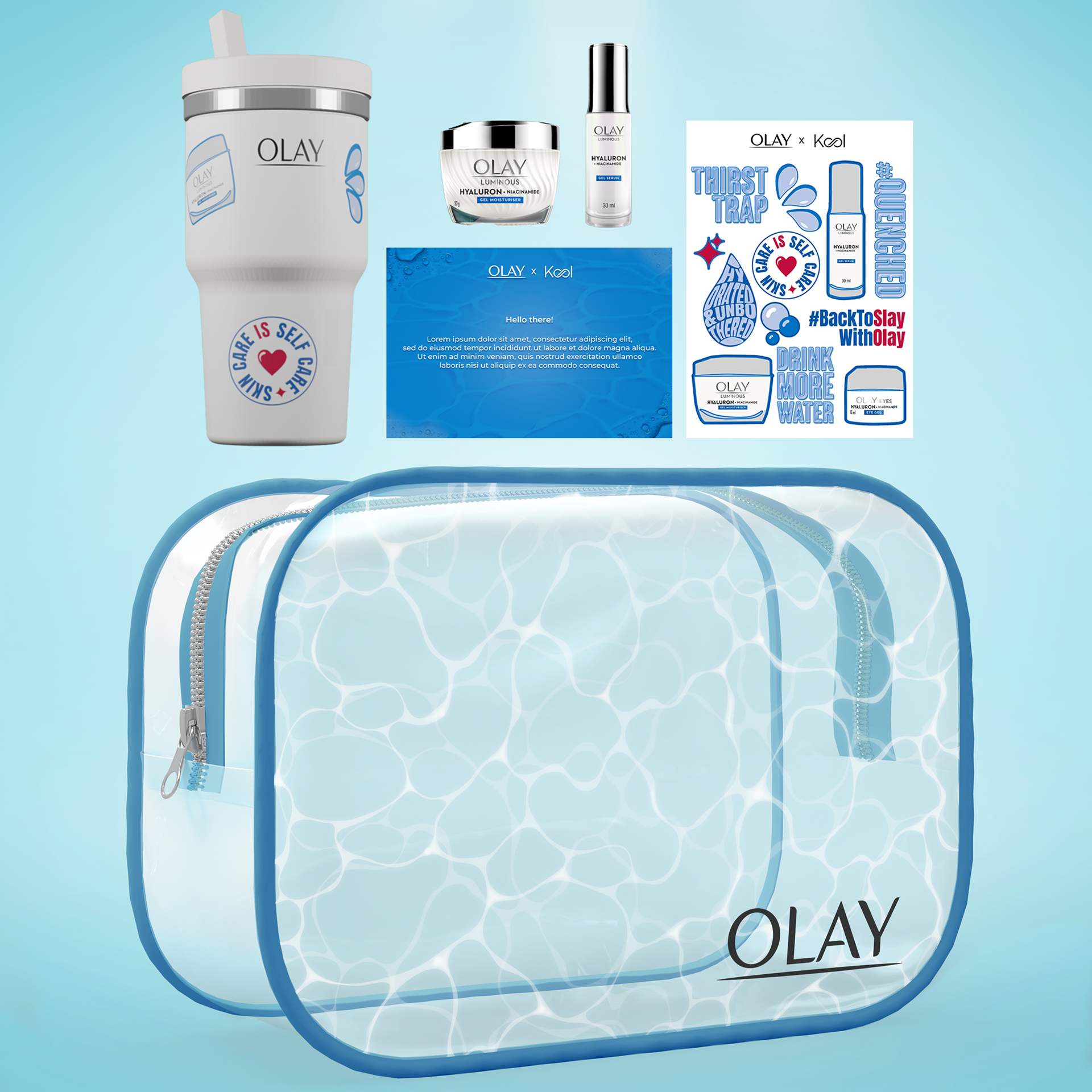 Olay is a global skincare brand known for its innovative products and focus on healthy, radiant skin. As a designer at Hatch Corporate Solutions, I worked on a special collaboration between Olay and Kool, creating a PR kit that reflected both brands’ identities and resonated with their audiences. I designed branded items and mockups that captured the essence of the collaboration, crafting a cohesive and visually appealing unboxing experience that highlighted the partnership’s playful yet premium vibe.